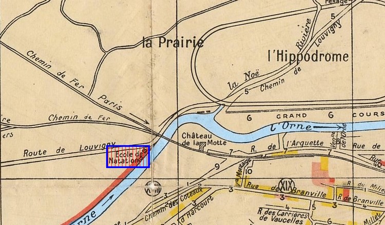 "k" le barrage sur l'Orne une passerelle (de la largeur d'un homme utilisée par les pontonniers pour vérifier l'état des vannes) qui relie les cours Montalivet et Cafarelli.