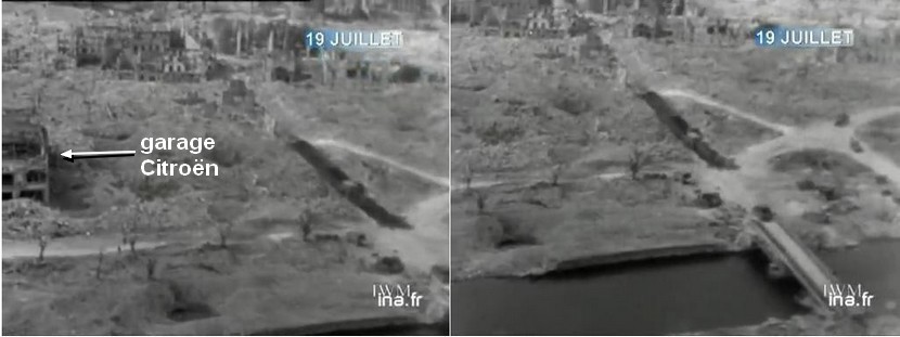 A droite photo aérienne fin juillet, au bout du Grand Cours la Passerelle écroulée dans l'Orne, au centre un pont flottant, dans le fond le pont de Vaucelles en ruines dans la rivière, le Monty's bridge qui le remplacera sera inauguré le 13 août.