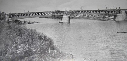 Photo collection André Grand. Le Tickell bridge, triple triple de 84 t avec contreventement supérieur, rive gauche en amont le 31 mars 1957 .