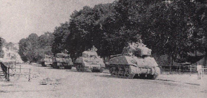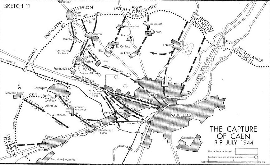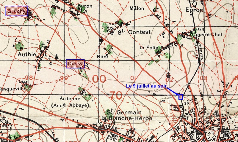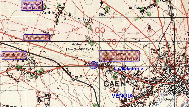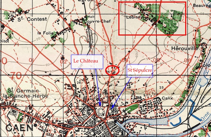 05 h 00. Une section de la Cie A celle du Lt R. Wise descend la cote 64 (aujourd'hui dans le quartier de La Pierre Heuzé) vers le Sud-est, appuyée par un peloton de Sherman. objectif: le cimetière Nord-est et le pont de Calix sur le canal.