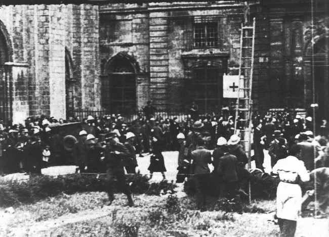 Vers 11H30, une mitrailleuse allemande en position de tir, place des Tribunaux, avec ses servants à plat ventre, le tireur, doigt sur la gâchette, les deux autres, bandes de balles aux mains. Une deuxième mitrailleuse est en même position place Malherbe et un guetteur est posté sur le parvis de Notre-Dame de la Gloriette.