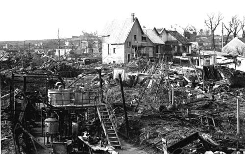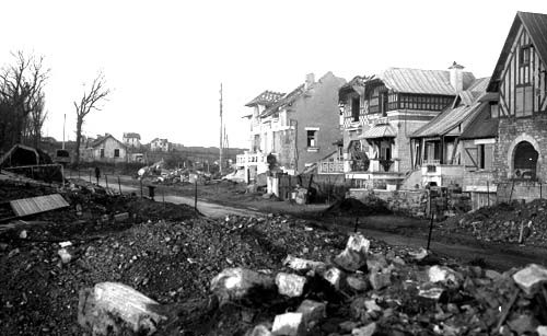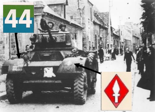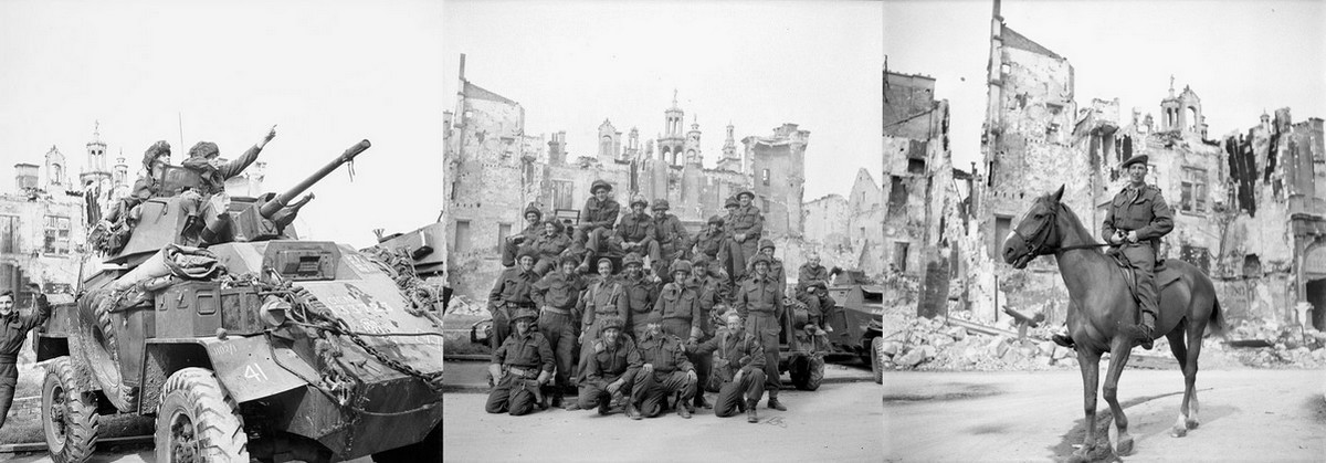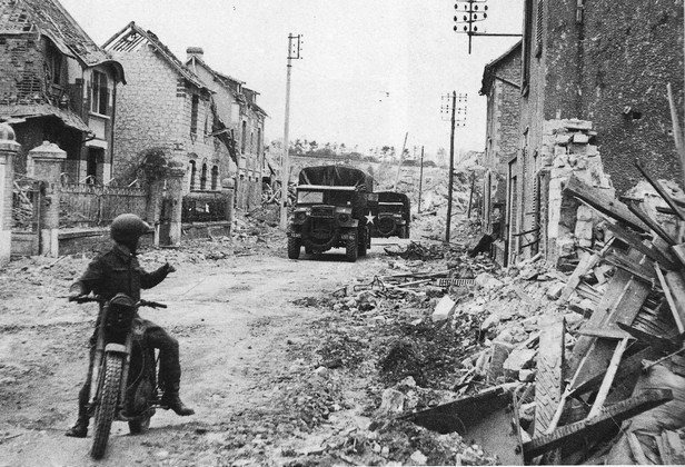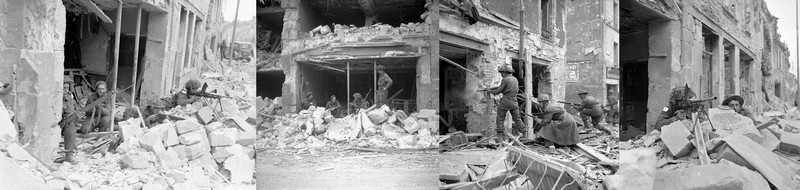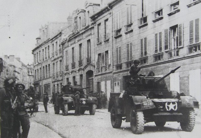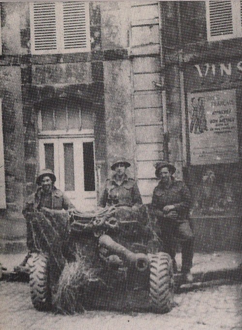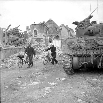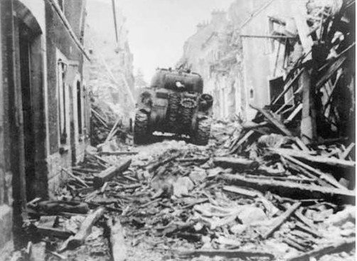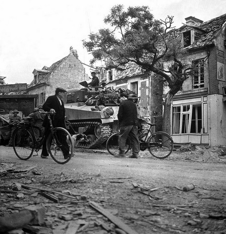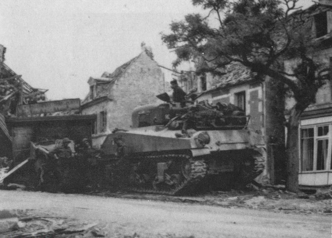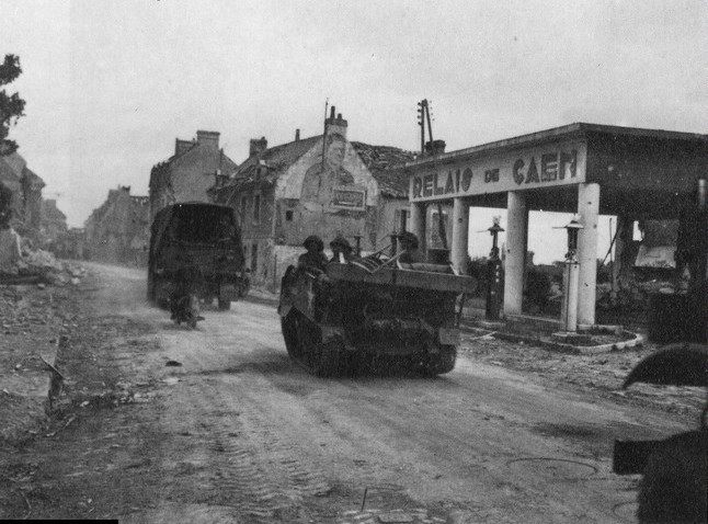 Le 9 juillet, dans le quartier du Moulin-au-Roy, un blindé léger (Morris Light Reconnaissance Car Mark II ) de l’armée britannique se fraie difficilement un chemin à travers les ruines.