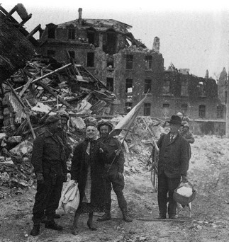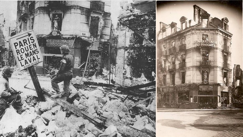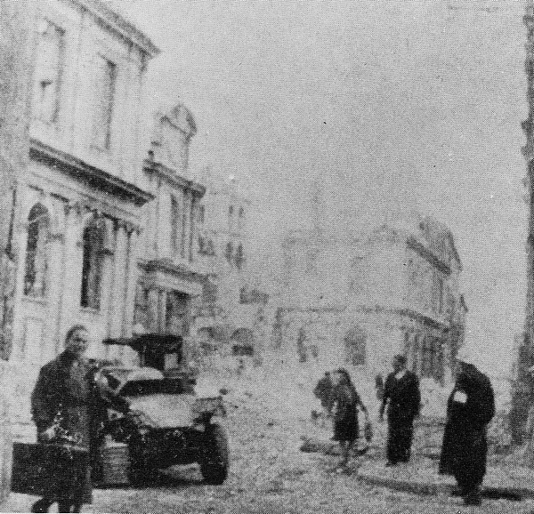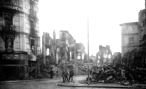 12 h 30. Une patrouille rue des Fossés Saint-Julien rencontre une équipe de déblaiement qui s'active dans les décombres d'un immeuble touché par un obus.