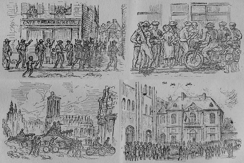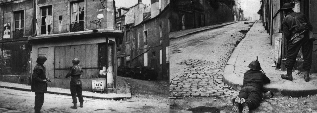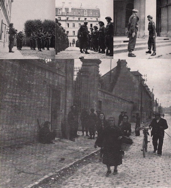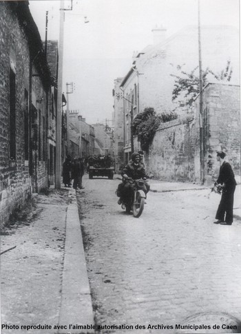Vers 9 heures. des soldats allemands descendent la rue de Bayeux, en courant, chacun prend un poste sous les portes cochères, ils s'embusquent dans les corridors des maisons, à toute vitesse ils barrent la rue avec des chevaux de frise.