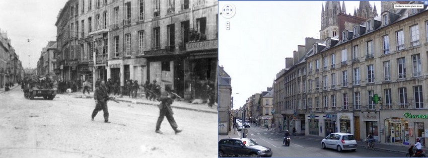 09 h 30. La Cie B guide le 2nd RUR dans sa descente vers la ville, lentement, en chassant systématiquement les Allemands qui se terrent encore, çà et là, dans les ruines. Le Calvaire Saint-Pierre (en haut de la rue de la Délivrande) est atteint, les blindés sont incapables de franchir les énormes cratères et les montagnes de gravats.