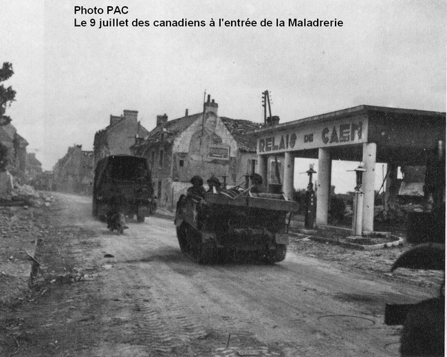 07 h 00. Des carrières de pierre sont dépassées et des mortiers de 8 cm abandonnés sur place sont rendus inutilisables par les pionniers. "La progression reprend à travers un terrain bouleversé. Seule menace, toujours la peste des tireurs isolés équipés d'armes automatiques et de fusils à lunettes. Depuis les hauts murs d'un grand cimetière (le cimetière Nord-ouest ou Saint Gabriel), deux "spandaus" nous arrosent et nous dévions prudemment sur notre gauche. Nous sommes à Saint-Julien, dans les premières maisons de Caen, il est 07h20."