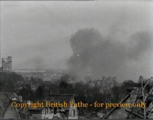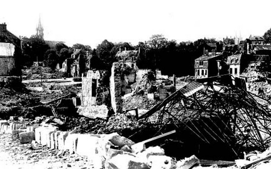 Les derniers Allemands franchissent l'Orne sur les ruines des ponts détruits et sur des radeaux à l'abri des grands arbres du Grand Cours.