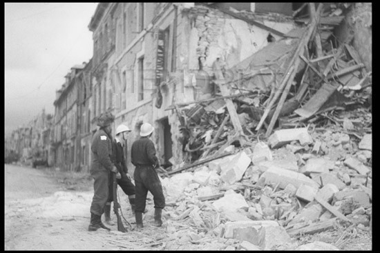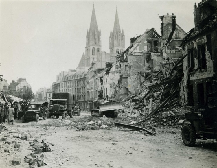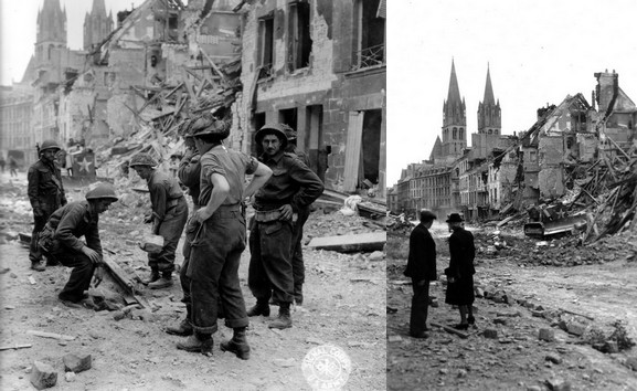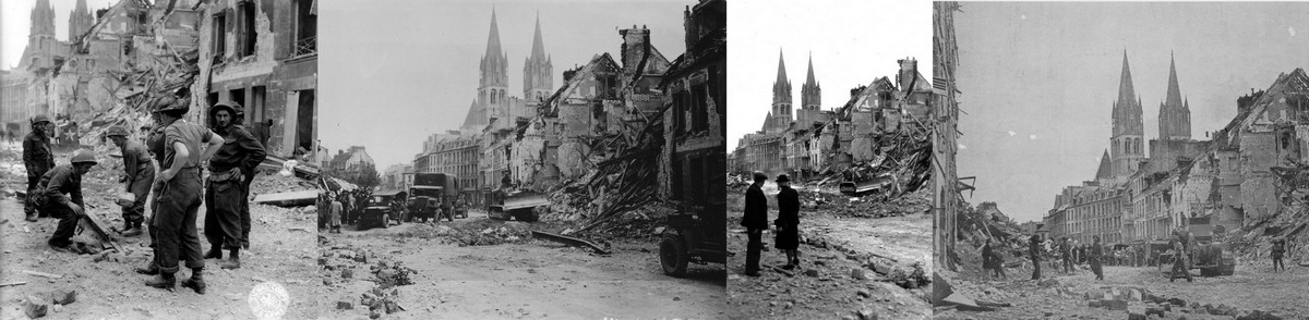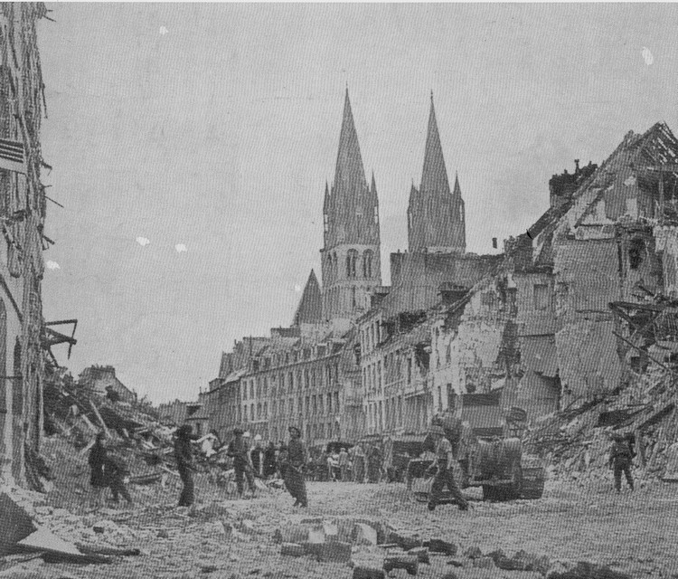 Sur ce site avec cette légende: p000006 "Conseil Régional de Basse-Normandie / Archives Nationales du CANADA" Un couple d'habitants regarde un bulldozer canadien déblayant les ruines de maisons détruites, rue de Bayeux, à Caen. En arrière-plan, les deux clochers de l'abbaye aux Hommes sont restés intacts malgré les bombardements alliés. 10 juillet 1944.