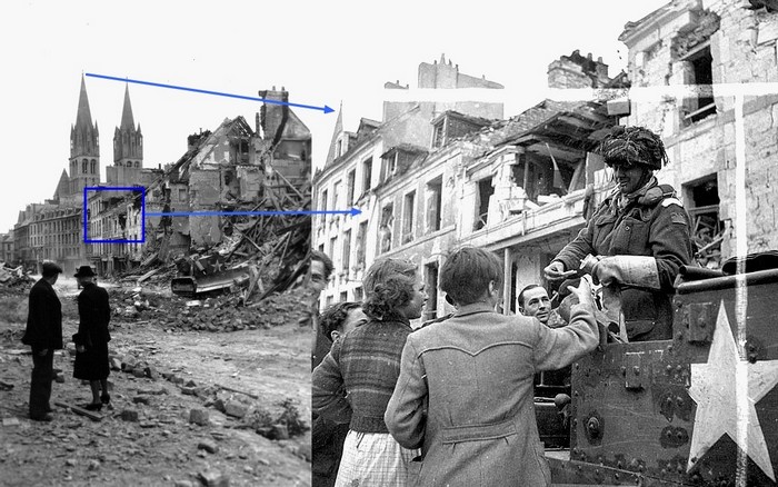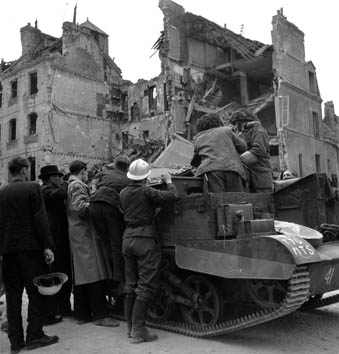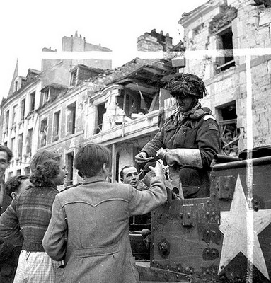 Source ce site avec cette légende: Canadians capture Caen. Caporal J.R. Pelletier in Bren carrier handling out cigarettes to civilians. 10 July 1944, Caen, France. Remarquez le traçage pour le développement. Séquence filmée voir en 4:22