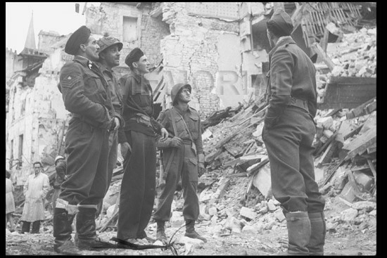 Source ce site avec cette légende: p010274 "Photo: Conseil Régional de Basse-Normandie / Archives Nationales du CANADA" Des Français se rassemblent autour d'un véhicule chenillé pour recevoir des cigarettes et des sucreries des soldats canadiens. En arrière-plan, les immeubles sont fortement détruits. 11 juillet 1944. Caen (Calvados)