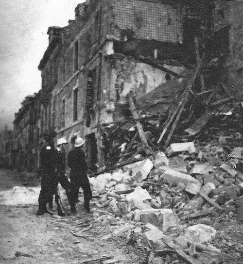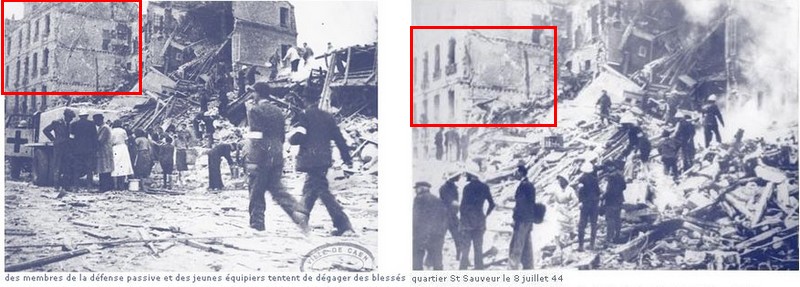 Le Bren est arrêté devant la venelle Crespellière (de nos jours), les deux photos ont été prises au même endroit c'est le photographe qui est passé de droite à gauche de l'engin, photographiant les deux côtés de la rue ayant subis un bombardement.