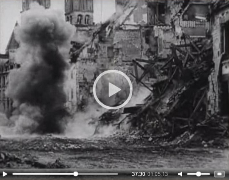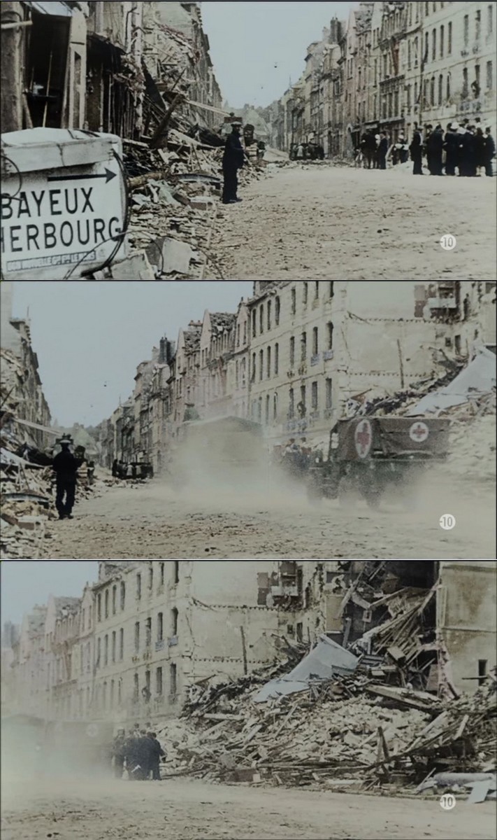 J'ajoute également, cette copie d'écran de ce film qui montre que les sapeurs canadiens ont fait sauter une munition non explosée dans la rue de Bayeux d'où le trou visible sur les photos ci-dessus.