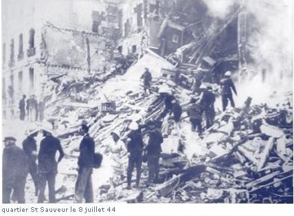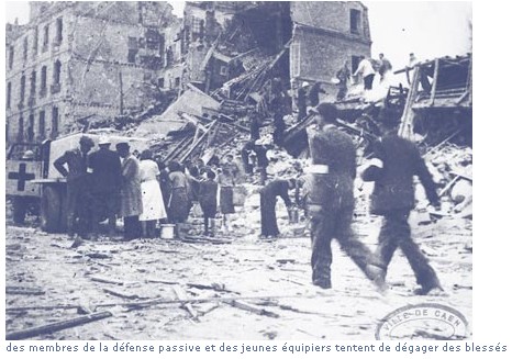 8 juillet, dès 8 heures du matin, des avions continuent, vague par vague, de lâcher des chapelets de bombes. Je me rends au PC des Equipes d'Urgence. Soudain, une violente déflagration. Les vitres des maisons volent en éclats. Une torpille anglaise vient de tomber rue de Bayeux, à la hauteur du n° 14. On tente de déblayer les gens ensevelis. J'aide à transporter des blessés ensanglantés. Je vois peu à peu mes chaussettes et mon pantalon se teindre en rouge...