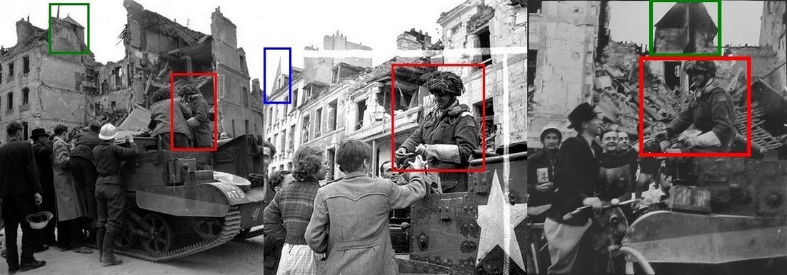 Les deux photos du site de la ville de Caen (dont une localisée au quartier Saint-Sauveur), le Panther le 8 juillet, Place de l'Ancienne Boucherie ainsi que le Bren canadien le 11 juillet sont toutes prises au même endroit ! Nous mettons en évidence des légendes erronées. AGRANDISSEMENT.
