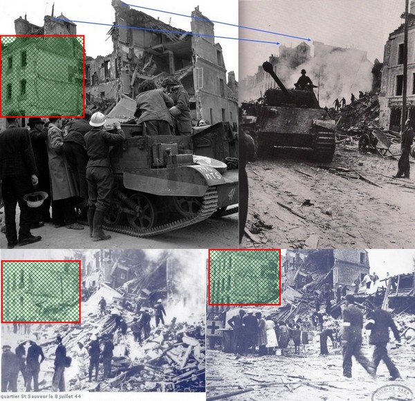 La seconde photo du Bren correspond à l'emplacement du garage et des ruines fumantes du 8 juillet. AGRANDISSEMENT. Nous cherchons un garage, près d'un immeuble en ruines suite à un bombardement du 8 juillet. La construction au sommet avec un toit à quatre pentes nous a emmené sur une fausse piste à savoir l'église Saint Sauveur. A l'examen de la tourelle, sous le toit c'est une simple fenêtre ! Ce type de construction est visible par exemple rue Saint Manvieu