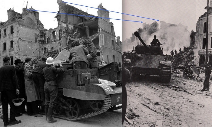 "8 juillet. Place de l'Ancienne Boucherie, une maison vient de subir un bombardement et vient de s'effondrer. Un char Panther, en arrière garde du SS-Panzer-Regiment 12. passe devant les ruines" (Photos: coll. JP. Benamou)
