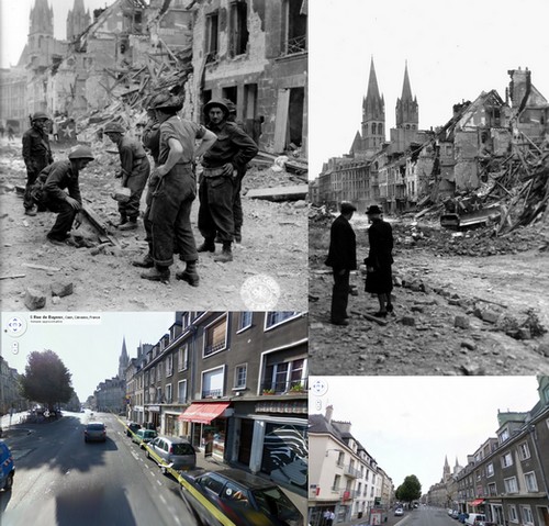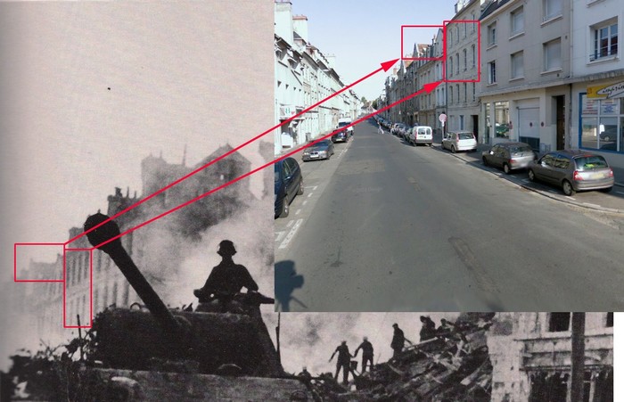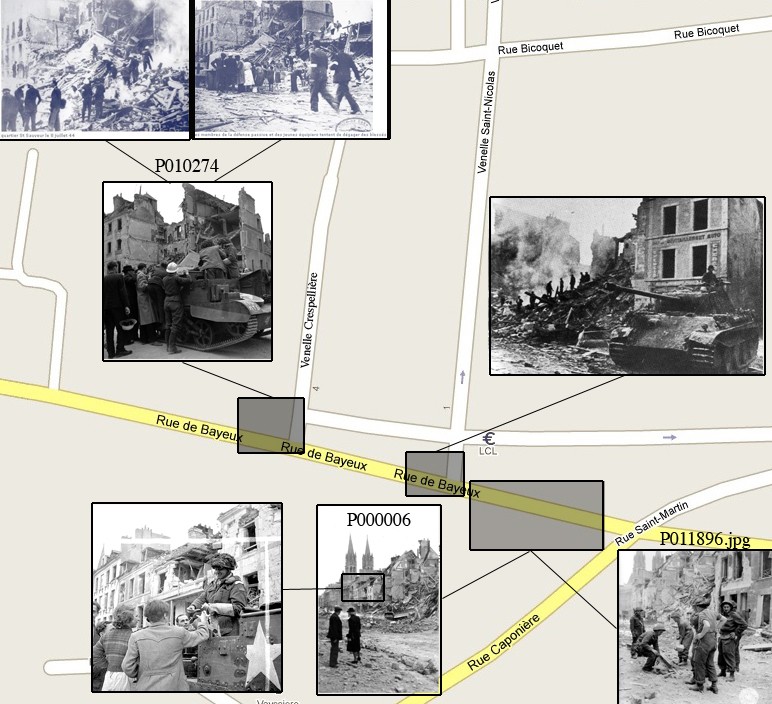 Ajout en mai 2017. Photo prise devant le N°16 rue de Bayeux juste en aval des immeubles détruits, les gravats encombrent encore la chaussée, des soldats canadiens et des civils poussent l'attelage. De nos jours.