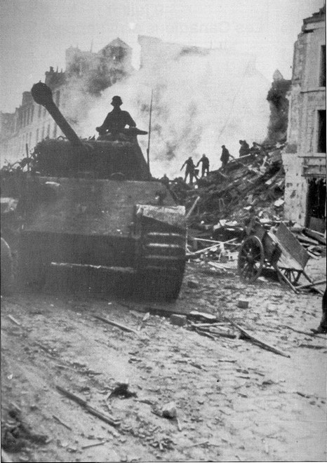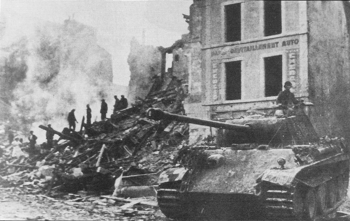 8 juillet. Place de l'Ancienne Boucherie, une maison vient de subir un bombardement et vient de s'effondrer. Un char Panther Ausf G, en arrière garde du SS-Panzer-Regiment 12. passe devant les ruines" (Photos: coll. J-P. Benamou)