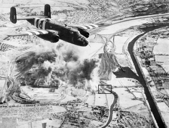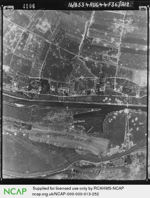 Ci-dessous, cette photo aérienne de la RAF du 4 août 1944 montre les impacts des bombes sur cette zone: le Matterstock Brücke est en place par contre le pont tournant d'Hérouville sur le canal est détruit.