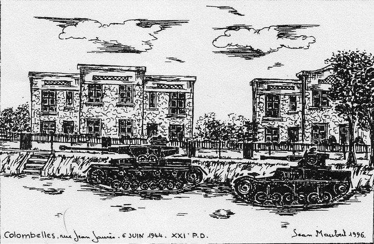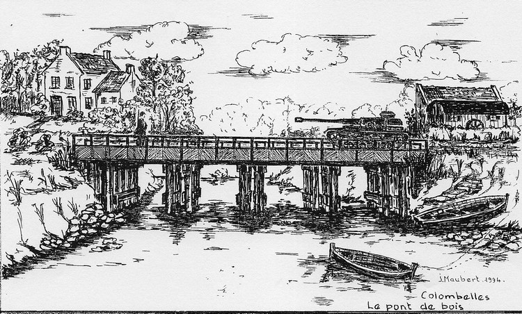 Ci-dessous un dessin de M. Jean Maubert, jeune colombellois de 14 ans habitant à l'époque venelle des Mûriers, qui a vu des chars allemands traverser l'Orne sur ce pont le 6 juin 1944.