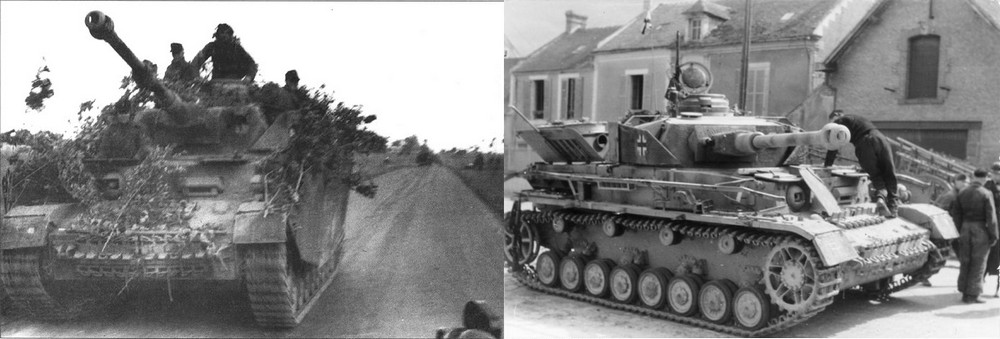 Des Panzer IV H de la 21. Pz-Div. vers le front de Normandie, à gauche sur la RN 13 à droite à Frénouville.