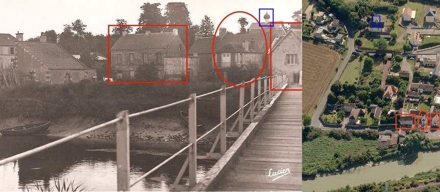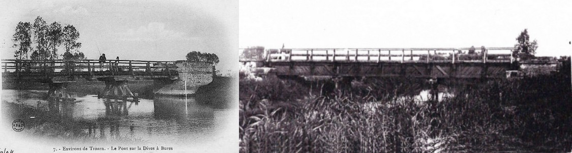 Source à gauche: le pont de la rue du Port vers le marais à Bures sur la Dives au début du XXe siècle. A droite: photo collection Jean Maubert. Le pont de Bures après guerre reconstruit avec des poutres clouées.