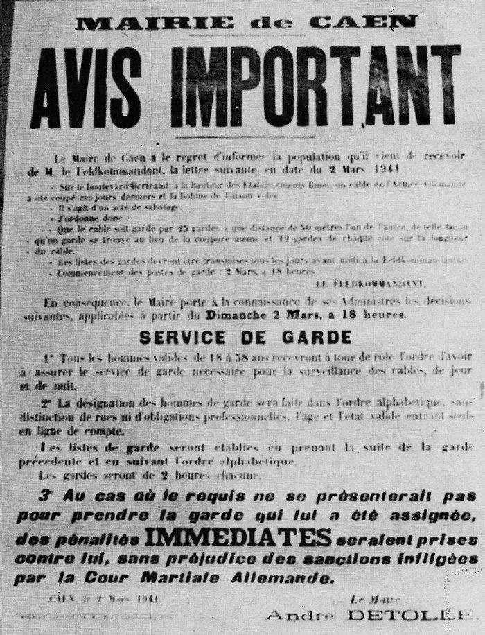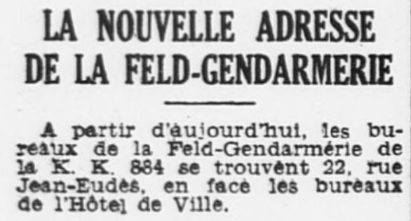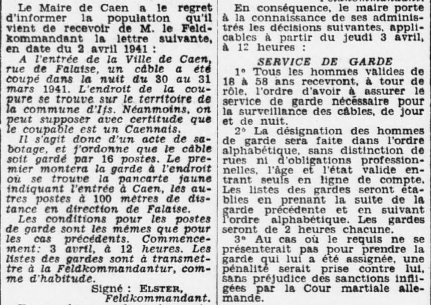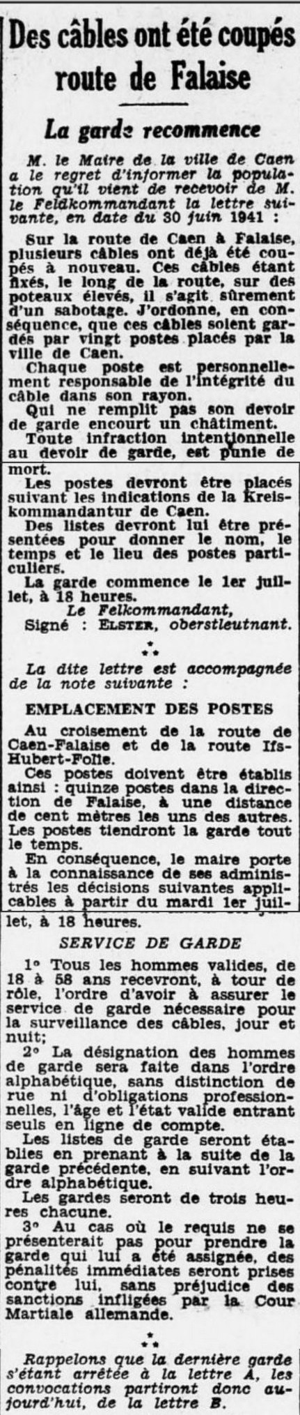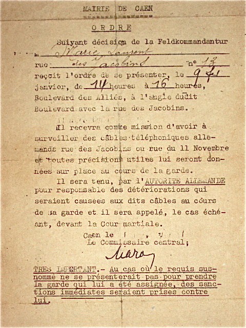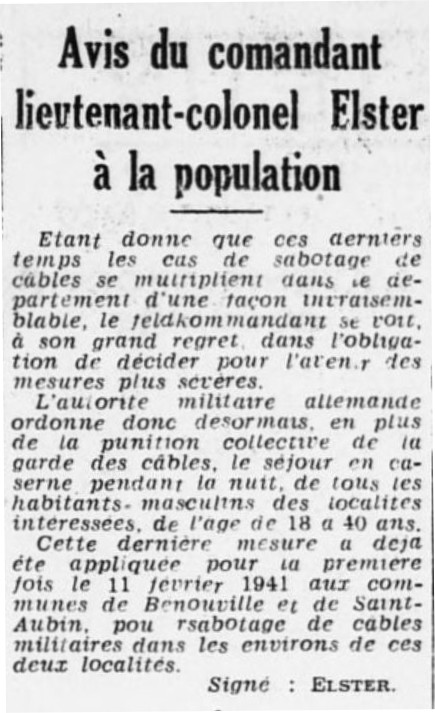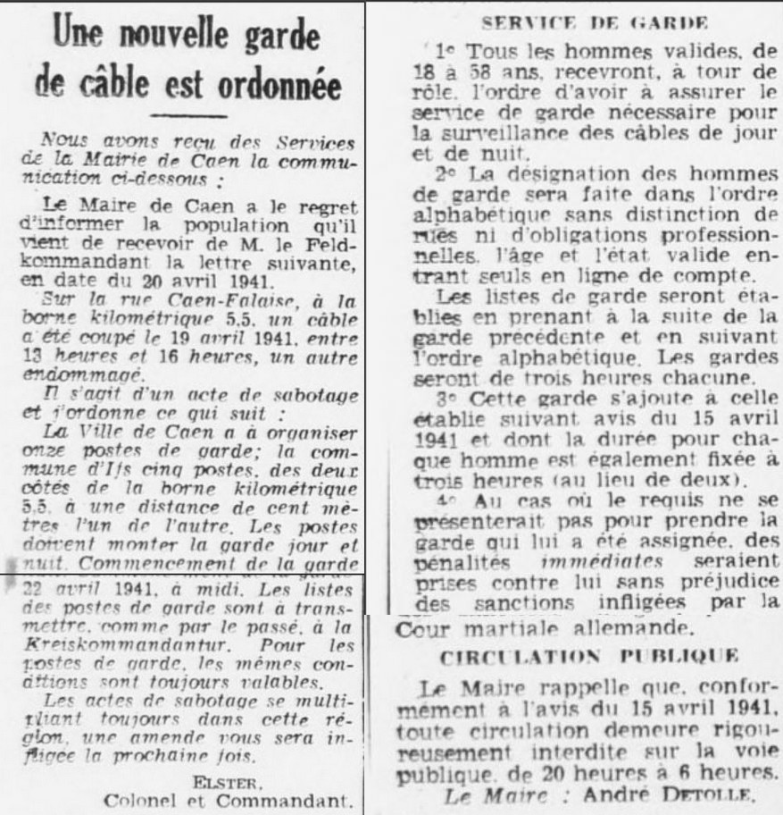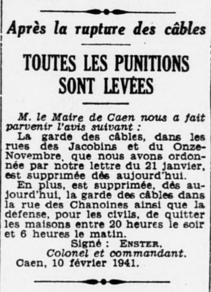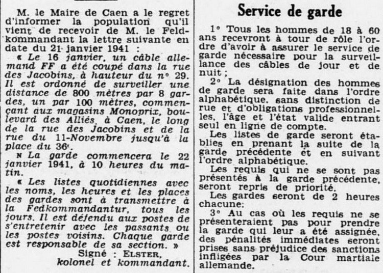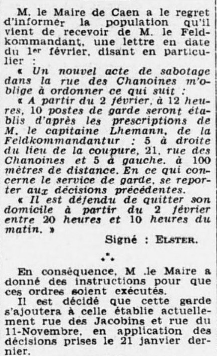 21 janvier: Suite au câble saboté au 29 rue des Jacobins, la Feldkommandantur 723 ordonne qu'il soit gardé par des requis à compter du 22.