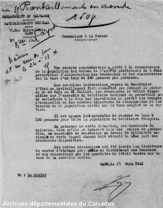 1 février: Magasins fermés pour hausse illicite; sur la proposition du Comité Départemental de Surveillance des Prix, lors de sa réunion tenue le samedi 25 janvier courant, le Préfet du Calvados a décidé de fermer : Jusqu'à intervention de la décision judiciaire, pour hausse illicite sur les prix de vente en gros, demi-gros et détail de vins de champagne, l’entrepôt sis rue de la Fontaine à Caen et appartenant. à M. René C., demeurant, 13 rue Hamon, à Caen. Pour une durée de un mois, le commerce de Mme A., née Julia N., épicière, 31 passage Bellivet à Caen pour vente de beurre et viande de porc au-dessus de la taxe préfectorale. Le commerce de Mme Emilienne B., 18 rue du Vaugueux à Caen, pour hausse illicite sur les prix de vente au détail des pommes de terre.
