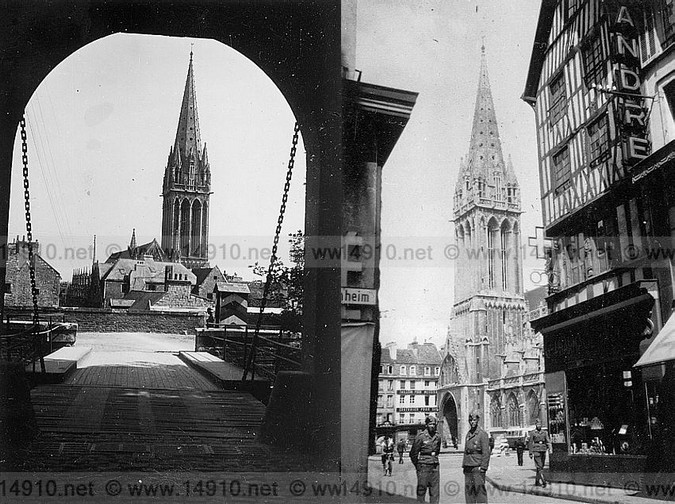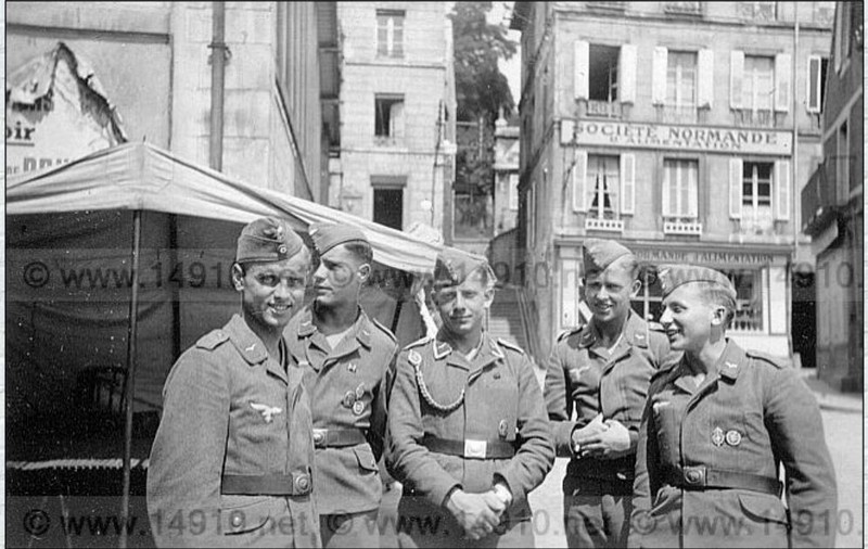 Source. Un groupe de 5 soldats allemands rue Basse devant la venelle Maillard à l'Est de la Tour Leroy. Ce sont des Fliegern (soldat de seconde classe) de la Luftwaffe (cf les pattes de col) certainemennt en garnison à l'aérodrome de Carpiquet.