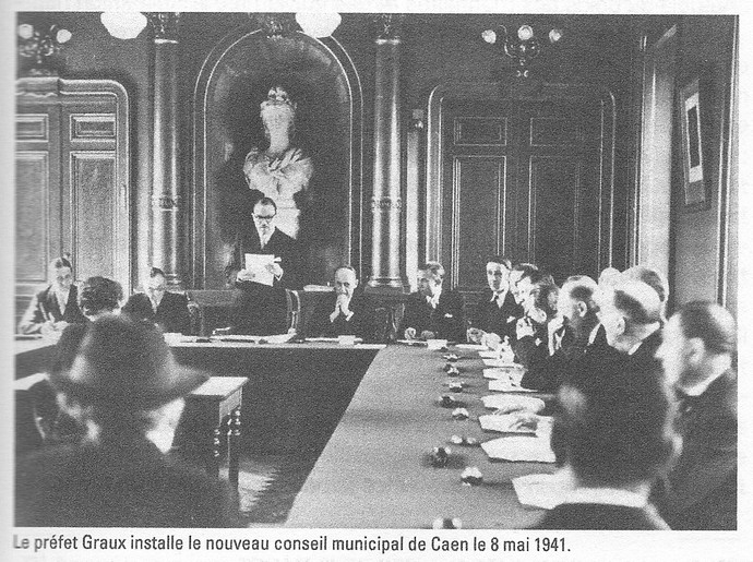 16 janvier: A 14 heures, dans la salle d'audience du tribunal civil de première instance se déroule la cérémonie d'installation de M. Perès. nouveau procureur de la République à Caen. M. Leroy, président du tribunal civil, occupe le fauteuil présidentiel, assisté de MM. Evrard. vice-président et Philippe, juge. Au siège du ministère public M. Jones Morgan, substitut du Procureur de la République, et au fauteuil du greffier, M. Séguin, greffier en chef. Parmi les magistrats entourant le tribunal MM. Le Len, juge au siège et Jacobsen. De nombreux avocats, ayant à leur tète Me Besnier, bâtonnier, accompagné des membres du Conseil de l'Ordre, sont présents dans la salle d'audience.