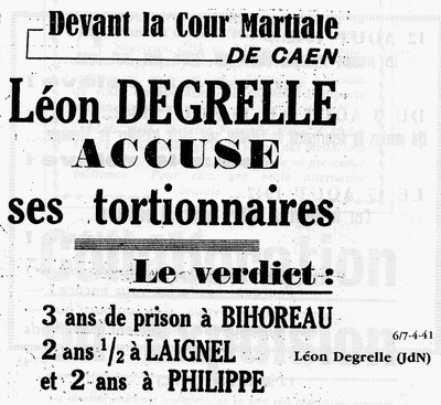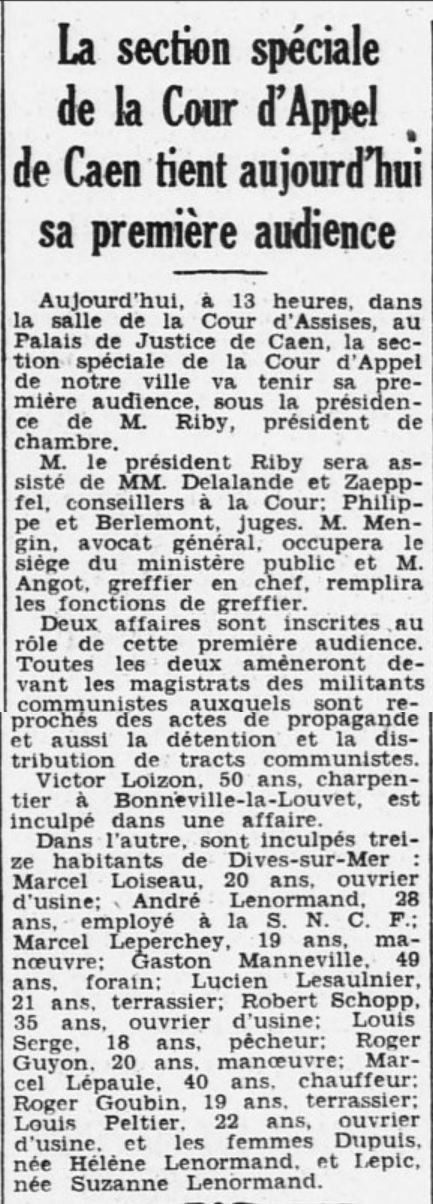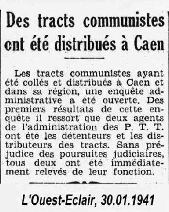 Article du Bonhomme Libre du 7 au 13 février 1941: Des militants communistes à l'ombre. La semaine dernière, un communiqué officiel apprenait que des tracts communistes avaient été collés en divers endroits de Caen. Deux employés des PTT ayant participé à ce travail, avaient été licenciés. Pour terminer ce communiqué, on laissait prévoir que ces deux individus auraient à répondre devant la Justice de délit de propagande communiste qui leur est reproché. En effet, ils viennent d'être arrêtés et en compagnie, d'ailleurs de six autres personnes. Les huit inculpés sont: