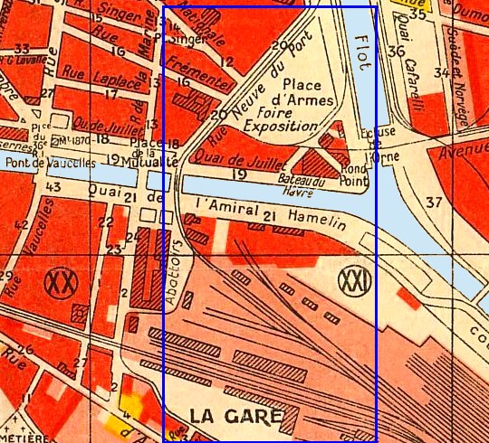 Plan de Caen, localisation de la rue Neuve du Port et de la Foire Exposition.