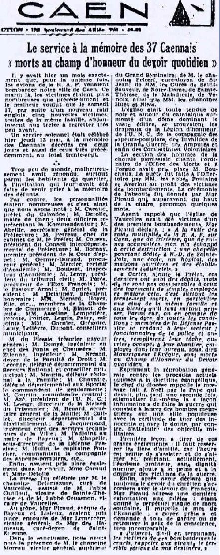 M. Gabriel Lemarchand, 64 ans, voyageur de commerce, rue Bénard ; Mme Juliette Lemazurier, 76 ans, sans profession, 98 rue Branville ; M. François Lagoutte, 43 ans, mécanicien, 212 rue d’Auge ; M. Hyacinthe Leclerc, 38 ans, négociant en charbon, 103 Boulevard Leroy ; Mme veuve Alice Verger, 60 ans,concierge, 72 boulevard Lerov ; Mme Marcelle Untrau, 32 ans et sa fillette Colette âgée de 5 ans, 20 rue Besnard; M. Jean Langevin, 59 ans, menuisier, 7 rue Gémare ; M Jean Gognelin,14 ans, écolier, 7 rue Victor-Lépine ; M. Michel Legall, 38 ans, employé des P, T.T., 32 Boulevard Leroy.