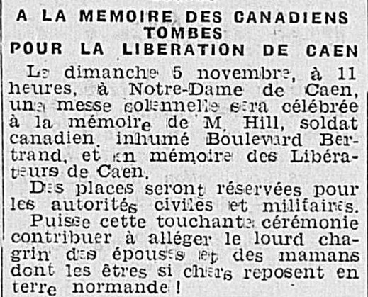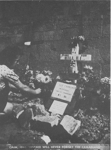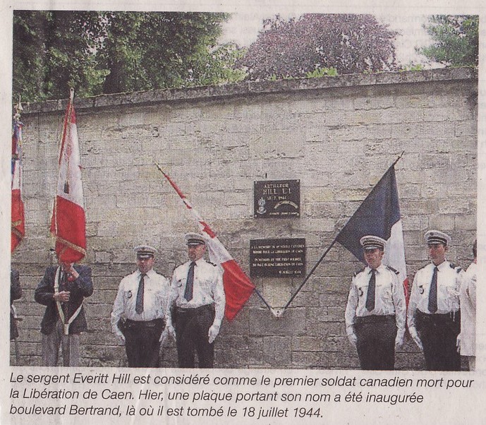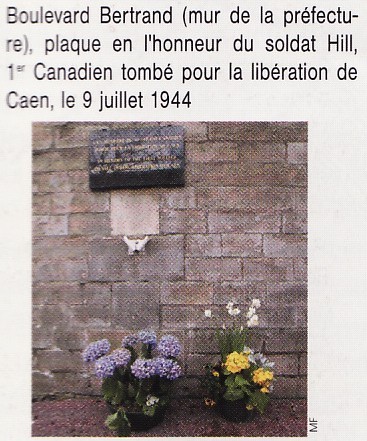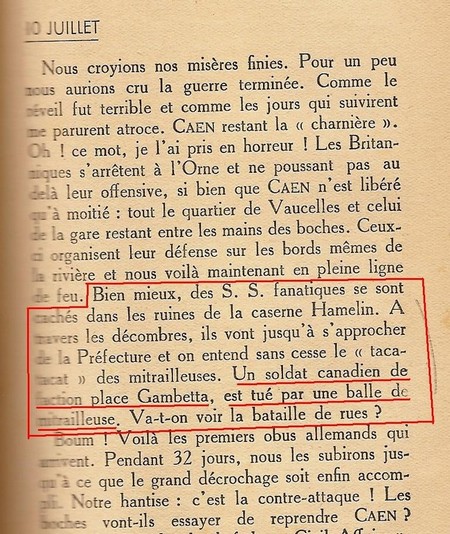 Dans son livre : La bataille de Caen, vue au jour le jour, 6 juin-15 août 1944, Caron à Caen, 1945 ; Joseph Poirier, 3ème adjoint du maire de Caen, directeur de la Défense Passive indique en date du 10 juillet la mort d’un soldat Canadien place Gambetta (proche du Bd Bertrand), s’agit-il de ce soldat ?