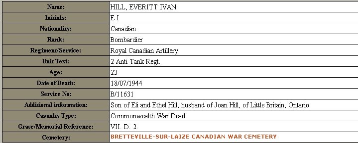 Un soldat Canadien E.I. Hill tué le 18 juillet 1944, matricule B 11631 ; à l’aide du site du CWGC nous trouvons :