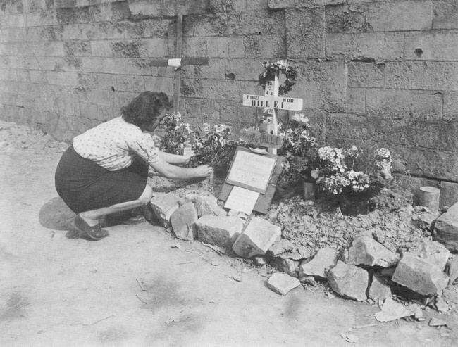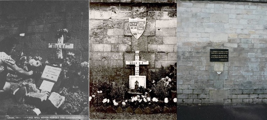 A gauche:« Photo Heintz » Légende: Boulevard Bertrand, un Canadien fut tué par un "Sniper"; à droite photo colorisée avec cette légende: "La tombe d'un artilleur est fleurie par la population civile qui n'en veut pas aux Britanniques pour la destruction de la ville et les nombreux morts.(Archives municipales de Caen)"