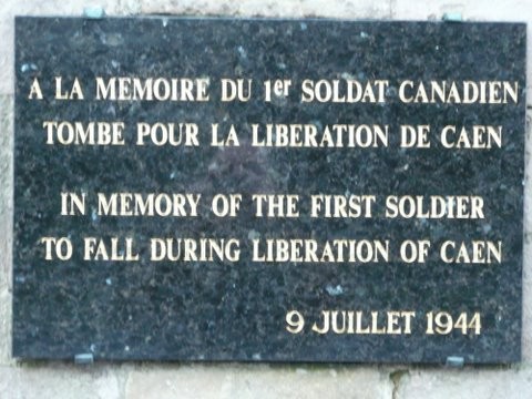 Si je sais bien lire, elle est dédiée au premier soldat canadien mort pour la libération de Caen ; plus une date : 9 juillet 1944, est-ce la date de la mort de ce soldat ou celle de la libération de Caen ou les deux ?