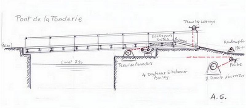 NB le pont tournant de la Fonderie (toujours en place en mai 2015) comporte deux plaques de fonte visibles sur les poutres avec la mention: Cie de FIVES- LILLE 1952.