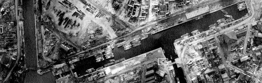 Sur cette vue aérienne de fin 1944, l'impact de bombe est bien visible (encadré blanc).