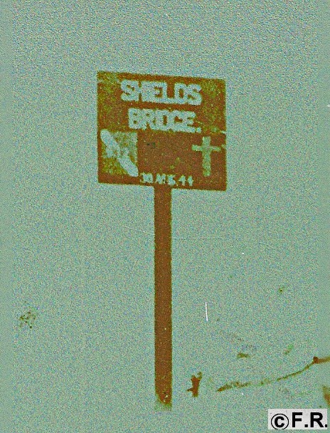 Pancarte installée par les Britanniques des Royal Engineers RE, lors de l'installation du pont Bailey coulissant, le Shields bridge. Détails: