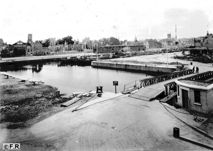 Le pont de la Fonderie est démonté et remplacé, par les Britanniques des Royal Engineers RE (certainement le 30 août 1944), par un pont Bailey coulissant le Shields bridge où sera installé en mai 1945 le contrôle d'accès au port.