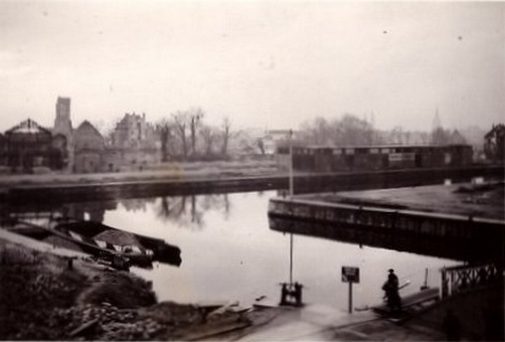 Photo IGN 11 mai 1953. Début des travaux de reconstruction du pont de la Fonderie, la maçonnerie du bajoyer rive droite ayant été fortement ébranlée par la bombe, il fut décidé de couler une dalle générale pour recevoir le pont tournant. A l’aval une passerelle piétons flottante et tournante. Bassin Saint Pierre, quai Vendeuvre, un bateau de bois du Nord pour Savare, on voit l’ombre des deux grues anglaises Stothert & Pitt qui déchargent.
