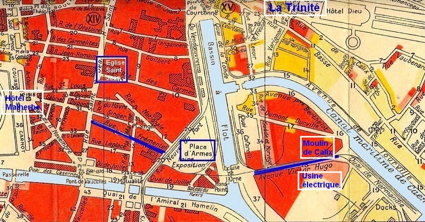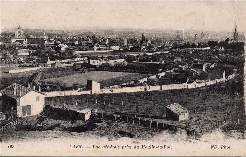 Photo Delassalle. Le photographe est dans la tour de l’église Saint Jean : au premier plan entre la rue Guilbert et à droite la rue des Carmes, puis le bassin Saint Pierre, le quai Caffarelli avec en face la rue Dumont d’Urville en haut à droite une usine; à gauche le pont de la Fonderie puis le canal de Caen à la mer, à droite du canal l’avenue Pierre Berthelot et à gauche l’avenue de Tourville en haut à gauche hors cadre l’Abbaye aux Dames.