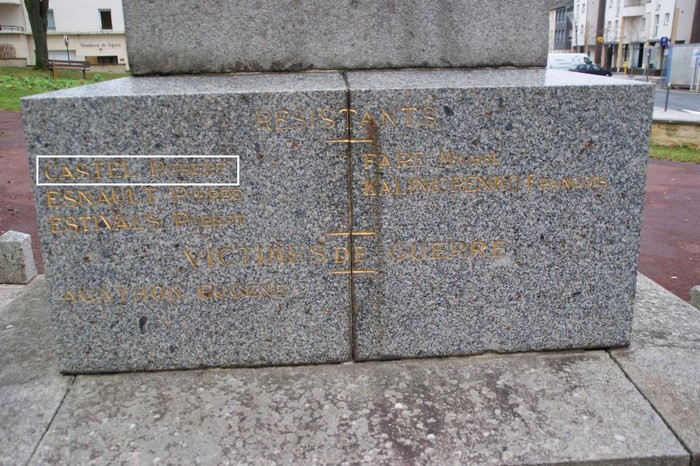 "En souvenir de Robert Castel, adjudant FFI, volontaire tué au combat qui libéra la ville de Caen. 1909-1944".