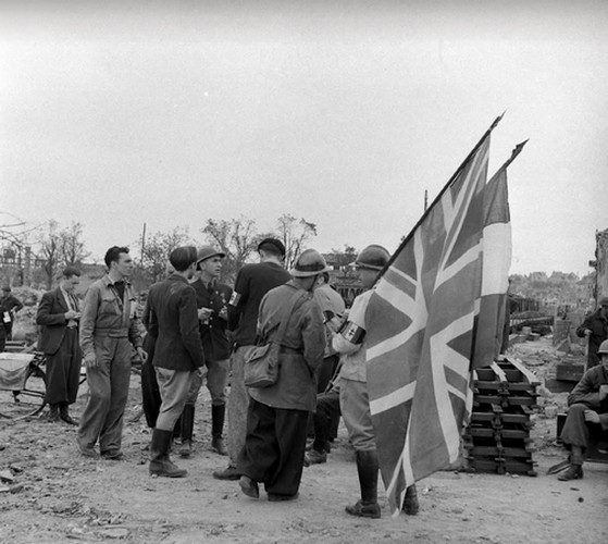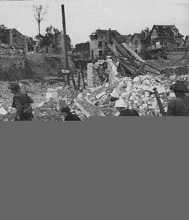 Source. Les hommes ( à gauche, en blouson Serge Goguel) sont rive gauche devant le pont Bailey Churchill bridge que l'on aperçoit à droite, ce pont construit par la 5th Field Co RCE le 20 juillet juste en amont du pont des Abattoirs relie le quai de Juillet au quai Amiral Hamelin en face des abattoirs municipaux dont on aperçoit le toit entre les deux casques. A droite source, ils sont rue de la Gare derrière eux le pont ferroviaire détruit.
