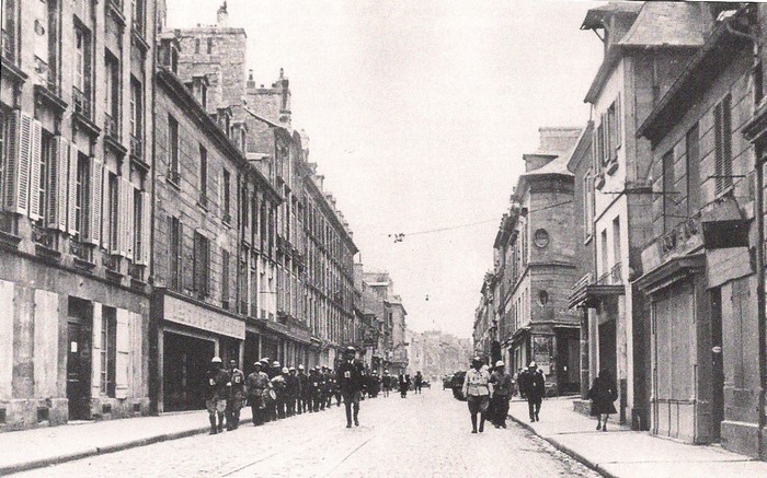 Source et source . Rue d'Auge, le carrefour avec la rue de la Gare hors cadre à droite. La colonne est passée deux fois devant le photographe après avoir fait demi tour (encombrement de la rue ?) Localisation des 5 photos ci-dessus.