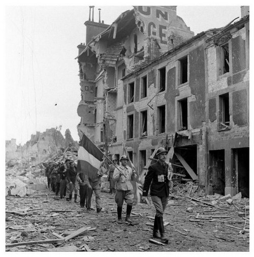 "Photo Mémorial de Caen " Source: page 105 de ce livre. La compagnie Fred Scamaroni défile rue Guillaume le Conquérant, au centre Léonard Gille, à droite casqué, vareuse claire, René Duchez.
