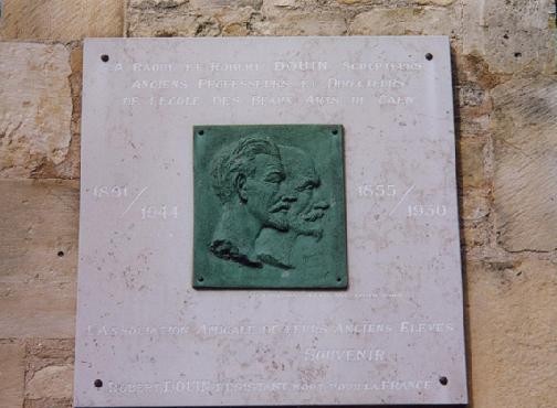 " A Raoul et Robert Douin sculpteurs. anciens professeurs et directeurs à l'Ecole des Beaux-arts de Caen - L'Association amicale de leurs anciens élèves - Souvenir - Robert Douin, résistant mort pour la France ".