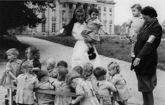 La Maternité dans le château de Bénouville. A droite avec un brassard FFI Mme Léa Vion.