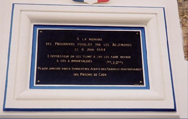 Cette plaque rappelle la mémoire des résistants qui, détenus à la maison d' arrêt de Caen, furent massacrés par les nazis au cours de la journée du 6 juin 1944.